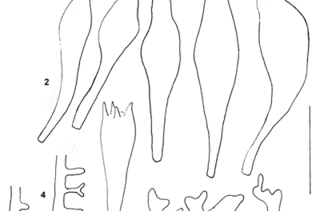 1. Hatthudshyfer, 2. Cheilocystidier, 3. Basidium, 4. Stilkhudshyfer, 5. Sporer, 6. Caulocystidier.