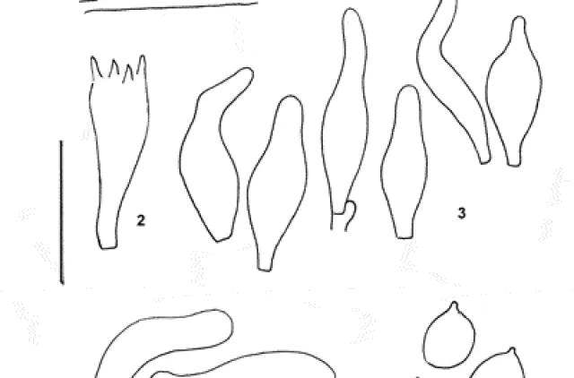 1. Hatthudshyfer, 2. Basidium, 3. Cheilocystidier, 4. Sporer, 5. Caulocystidier.