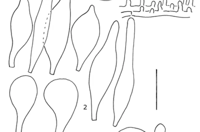 1. Hatthudshyfer, 2. Cheilocystidier, 3. Sporer, 4. Caulocystidier.