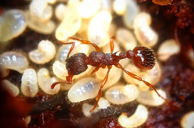 Arbeider av myreitermaur Myrmica scabrinodis som steller larver. Klingenberg, Elverum i Hedmark.