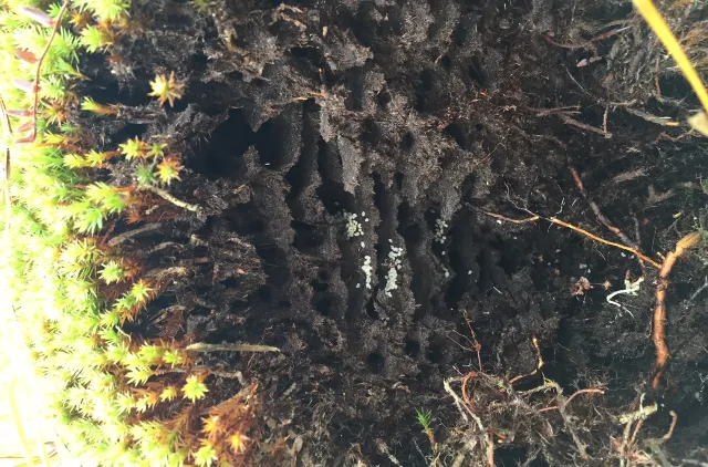 Tue av myreitermaur Myrmica scabrinodis i bjørnemose Polytrichum sp. Snitt som viser gangsystemer. Klingenberg, Elverum i Hedmark.