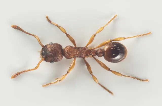Arbeider av myreitermaur Myrmica scabrinodis, fra siden.