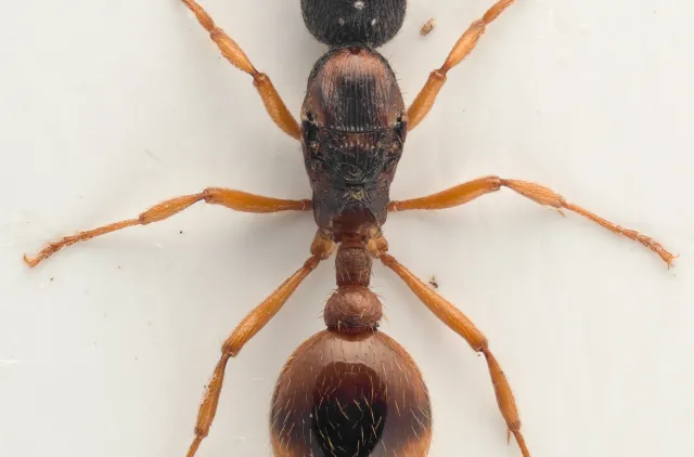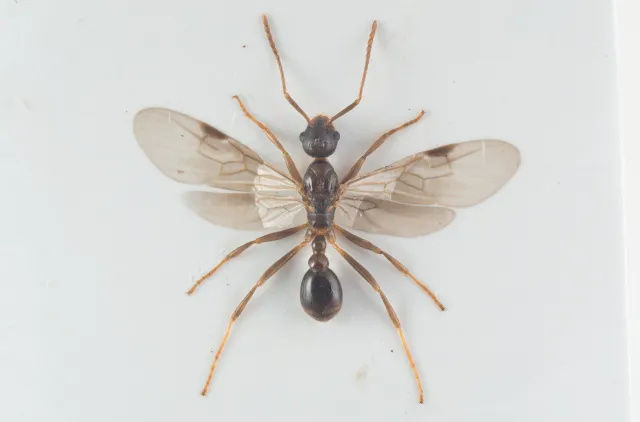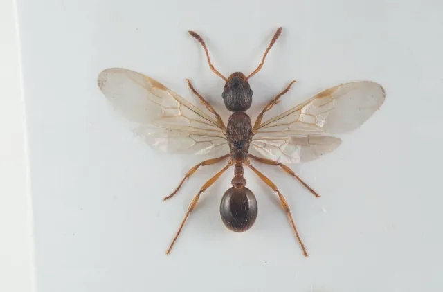 Dronning av hageeitermaur Myrmica rubra, fra siden.