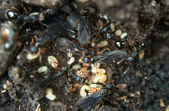 Lite bol av tregmaur Myrmecina graminicola med nyklekte hanner. Horten i Vestfold. 16. september 2015.
