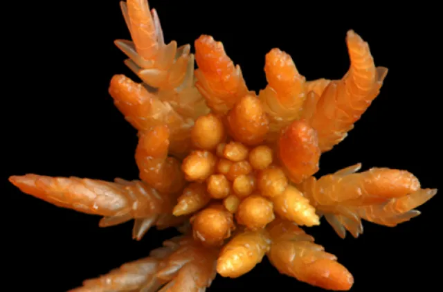 Skudd mellomstore, tett sammenstilte i kompakte puter. Hoder brune til brunoransje, nesten flate, utydelig 5-delte. Toppknopp synlig til utydelig, omgitt av snarlike innergreiner. Mellom- og yttergreiner sylindriske og rette, til yttergreiner ofte tydelig hornaktig sidebøyde med tett taklagte blad. Greinknipper tett sammenstilte, med 2 utstående og normalt 1 sped, blek stengeltilliggende hengegrein. Utstående greiner smalt tilspissede. Greinblad ikke-rekkestilte, tett taklagte, smalt eggformede. Stengel brunsvart. Stengelblad smalt rektangulære; bladspiss bredt avrundet og småfrynset. N = 19. Dioik. Sporehus nå og da. Sporemasse lysbrun.