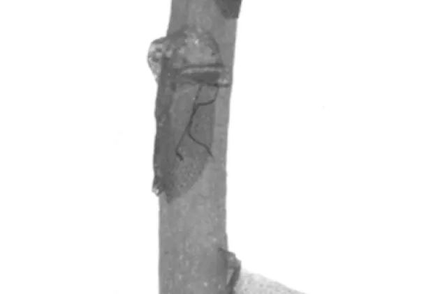 Stengelblad til venstre, greinblad til høyre med avkuttet, tannet spiss.Greinblad noe lengre enn stengelblad.