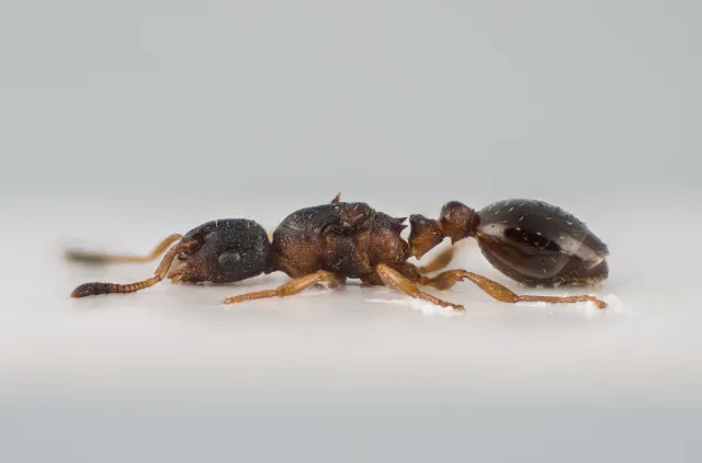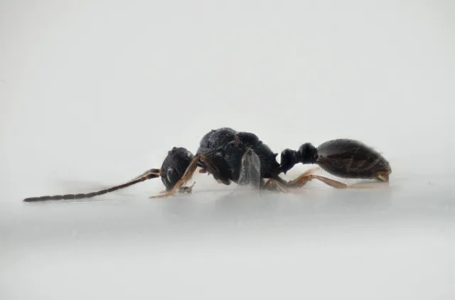 Dronning av snyltesmalmaur Leptothorax kutteri, fra siden. Legg merke til den kraftige parasittaggen på undersiden av postpetiolen.