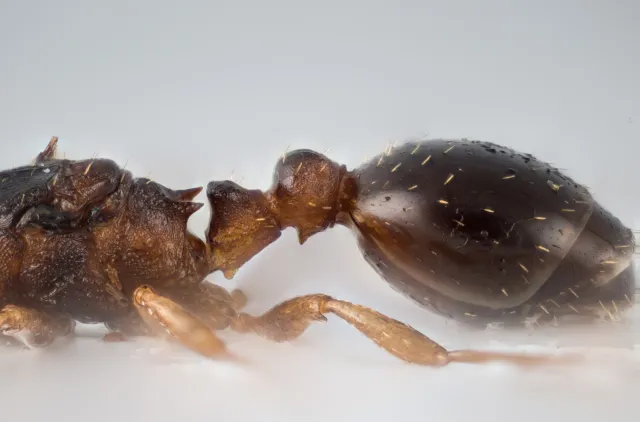 Hann av snyltesmalmaur Leptothorax kutteri, fra siden. Individet har kraftig utviklet ryggtagg.