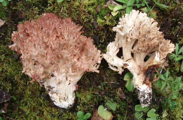 «Taigarødtuppsopp» har dypt purpur- til vinrøde greinspisser som ung (til venstre), men denne fargen blekner etter hvert, og fruktlegemene blir gråbleke over det hele (til høyre).