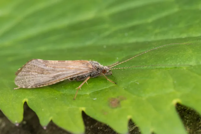 Slekten Hydropsyche kan kjennes på at antenneleddene har diagonale lister som gir antennen et spiralsnodd inntrykk.