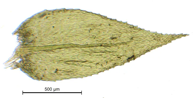 Arten vokser i lyse- til mørkegrønne matter. Størrelsen varierer mye, men skuddene er ofte 4–10 cm lange med uregelmessig fjærliknende forgreining. Greinene har ofte en noe flattrykt form, noe som skyldes at bladene sitter i to rader. Hovedstenglene er ikke flattrykte, her sitter bladene tydelig utsperret. Bladene er ovalt kort triangulære og smalner gradvis inn til en smal og plan spiss i øvre del. Bladnerven er lang og enkel og når minst 3/4 opp i bladet. Nerven ender vanligvis en tagg som stikker ut på ryggsiden av bladet. Bladkanten er som oftest tydelig og kraftig tannet. Bladcellene målt midt i bladet er 5–9 x 40–101 µm. Arten er sambu og har ofte sporofytter.