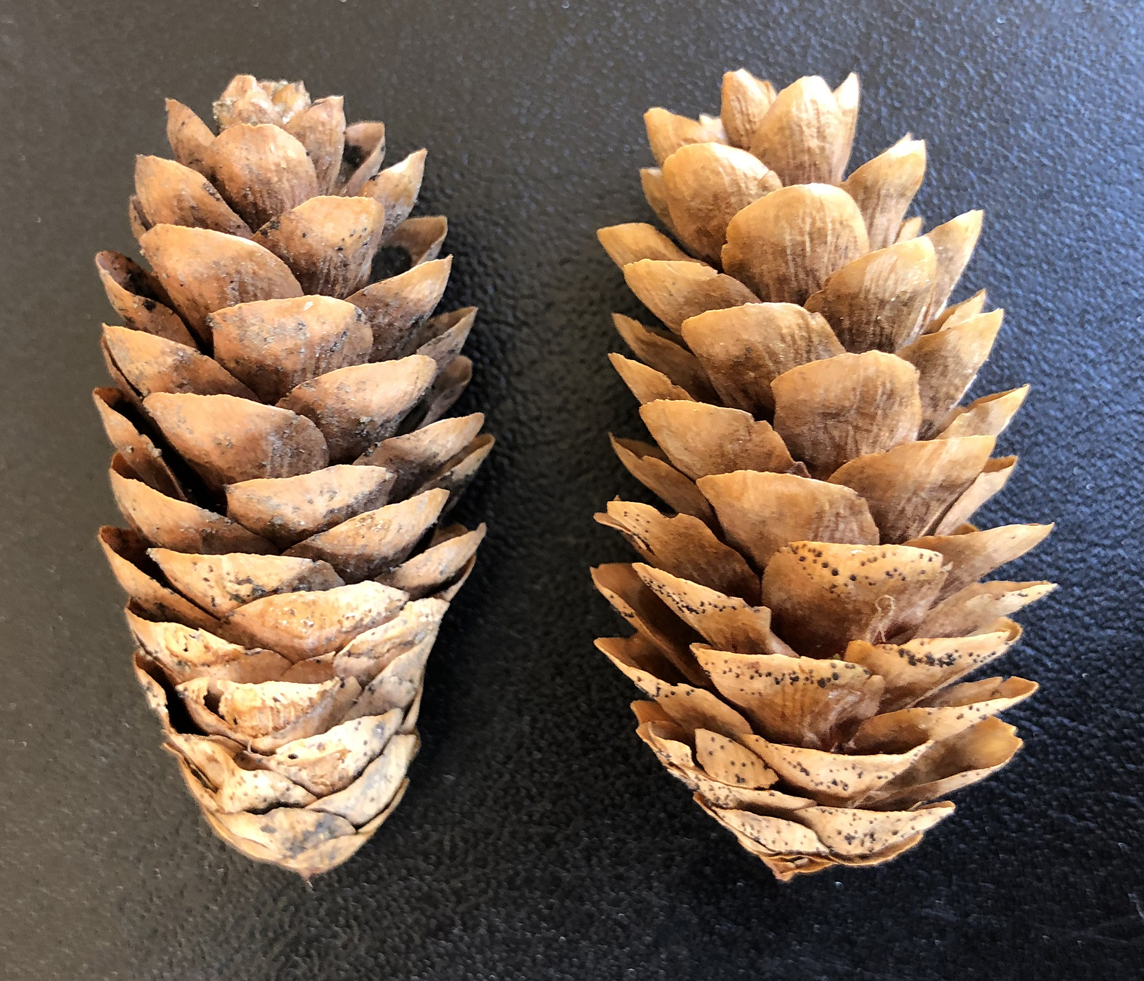 Konglene hos kvitgran har faste kongleskjel som er jamt avrunda i toppen.