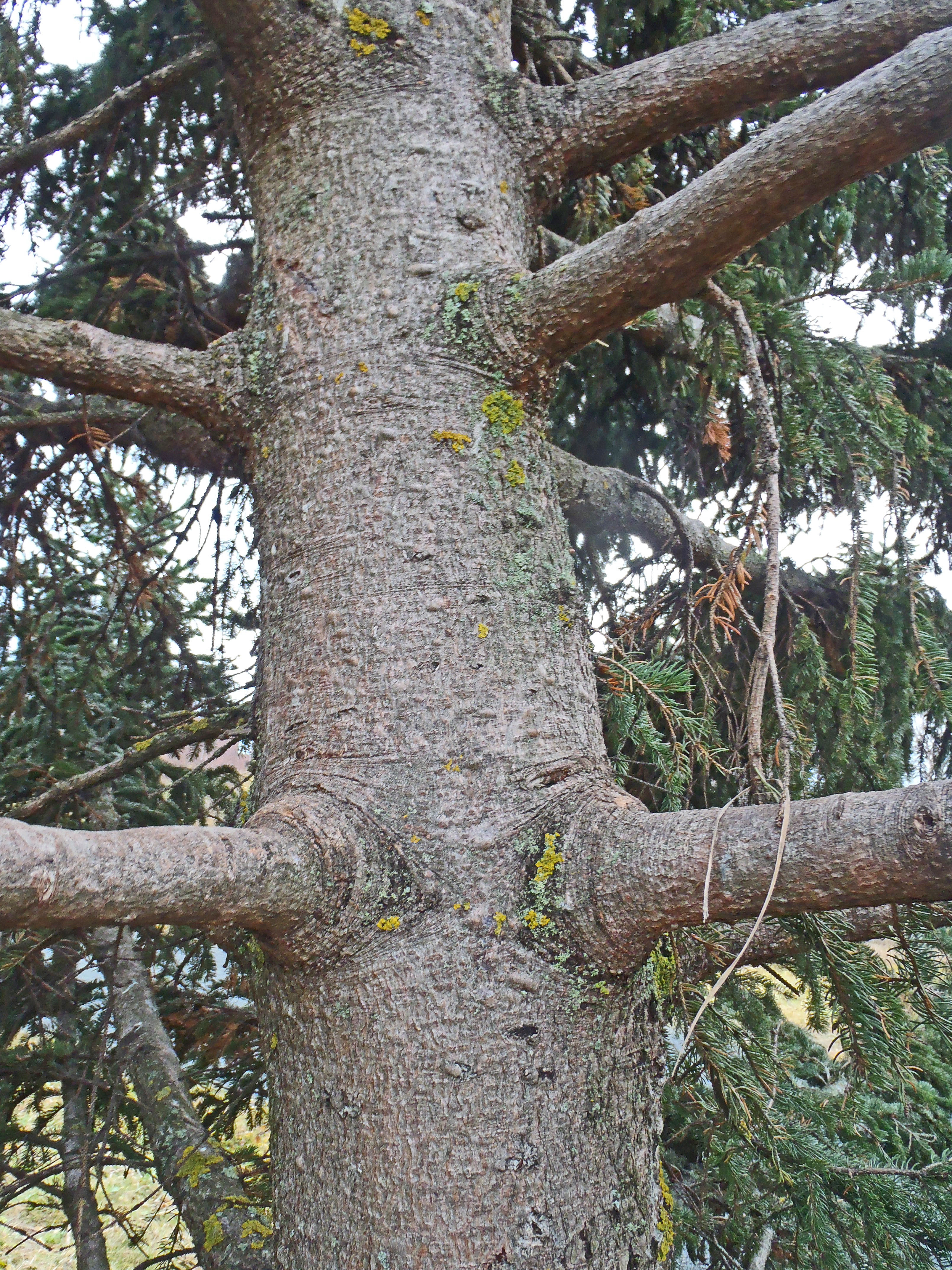 Granartane, her kvitgran, har meir jamn bork enn furu. Legg også merke til kransstilte greiner.