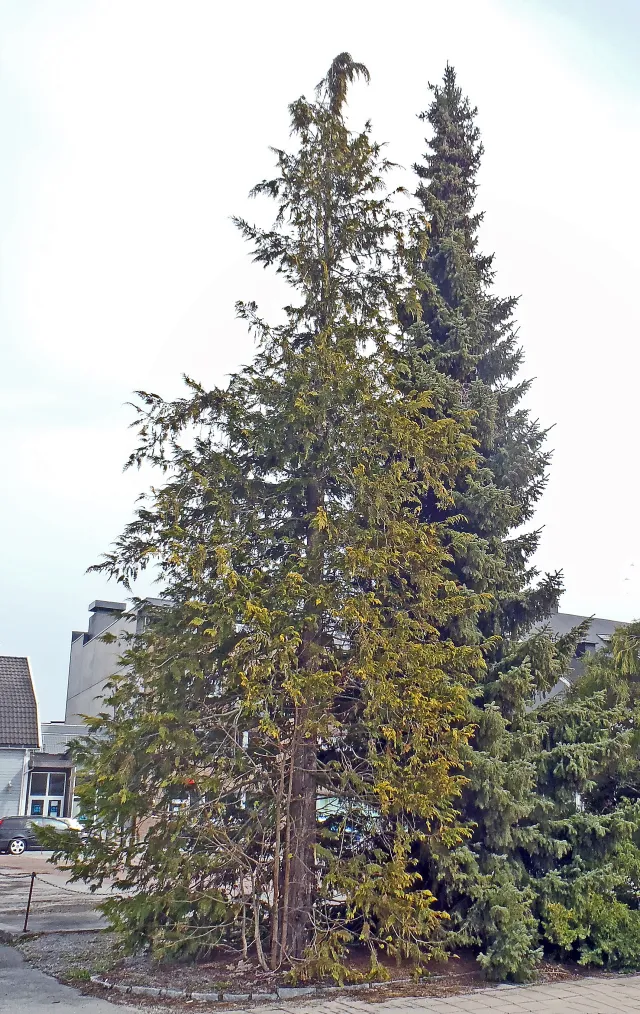 Lawsonsypress er nokså vanleg i norske hagar og parkar, her med ei serbargran bak, frå Hokksund i Øvre Eiker.