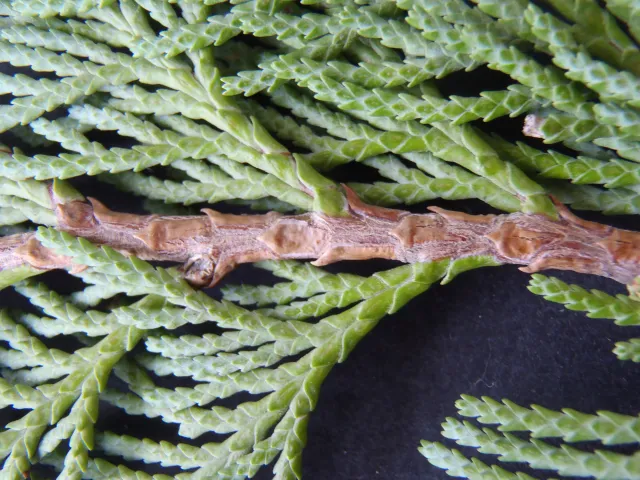 Blada på undersida av skotta hos lawsonsypress har ein bleik flekk ved grunnen.