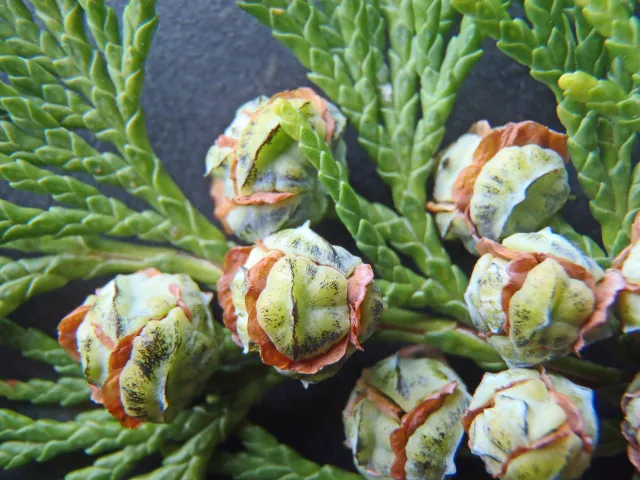 Her held konglene hos lawsonsypress på å opne seg, og frøa held på å falle ut.