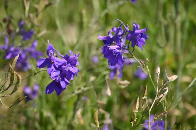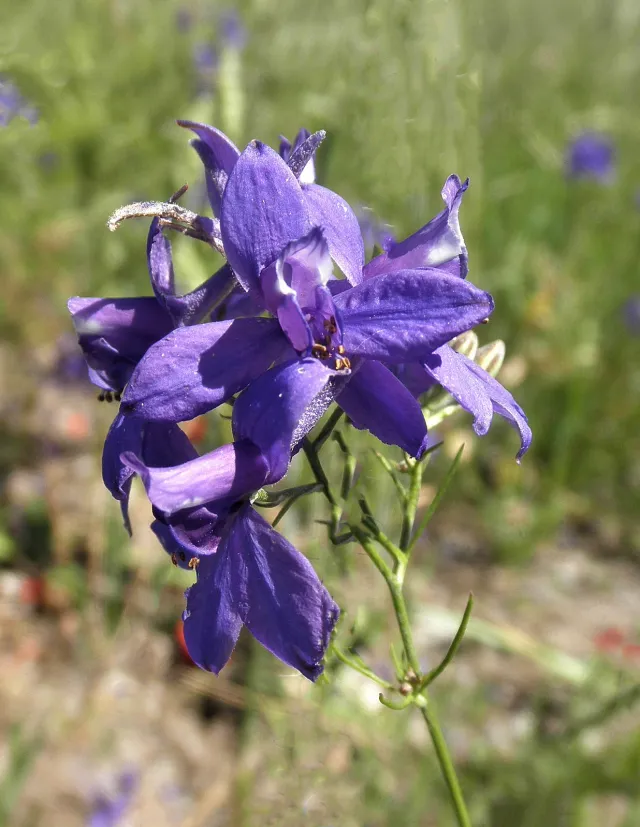 Blomane hos åkerriddarspore sit i ein kort klase med heile og linjeforma støtteblad.