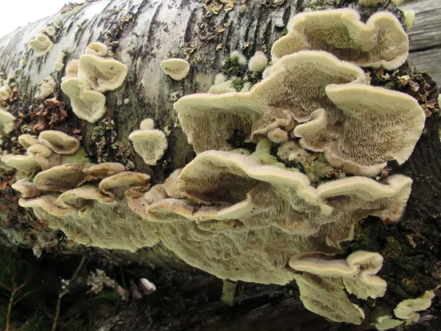Labyrintkjuke Cerrena unicolor vokser hovedsakelig på bjørk. Her fra Hestjuvnatten i Flå, 2014.