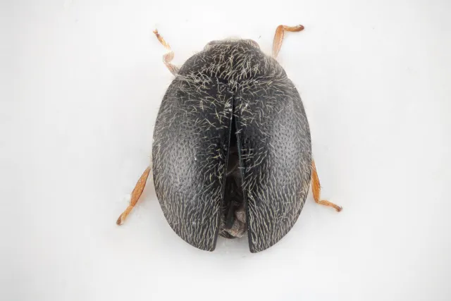 Punktmarihøne Stethorus pusillus fra undersiden.