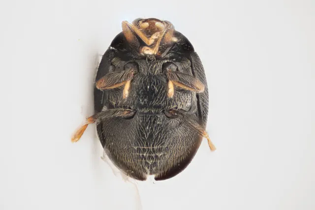 Punktmarihøne Stethorus pusillus fra oversiden.