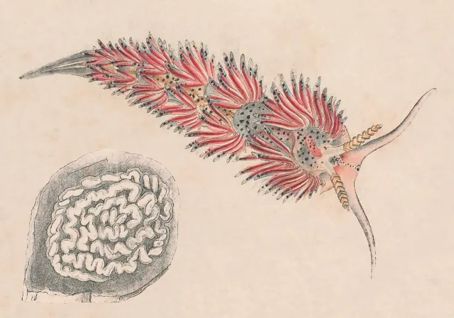 Slik illustrerte Joshua Alder og Albany Hancock arten som de kalte Eolis Coronata i 1845. De tegnet også eggstrengen.