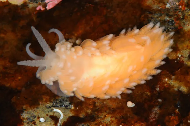 Den oransje fargen og tydelige vorter på rinoforene er gode kjennetegn for å kjenne igjen denne arten.