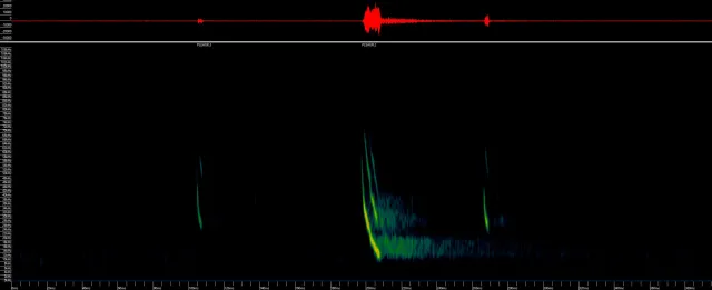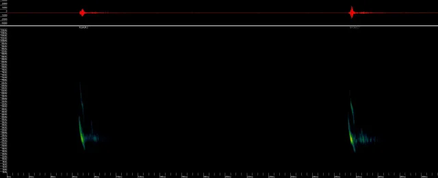 Et eksempelopptak som viser to ekkolokaliseringsrop fra nordflaggermus, hvor y-aksen viser frekvensene ropet utgis på (kHz), mens x-aksen henspeiler tiden (i millisekunder). I det gitte eksempelet er det flere essensielle komponenter som kan analyseres: ropet starter på omtrent 48 kHz, har en høyest desibel ved omtrent 27 kHz, avsluttes på omtrent 18 kHz, og varer i omtrent 6 ms. Ropet er etterfulgt av en lengre pause på 240 ms før det neste ropet starter. Merk også de tydelige overtonene (harmonics) til ropene.
