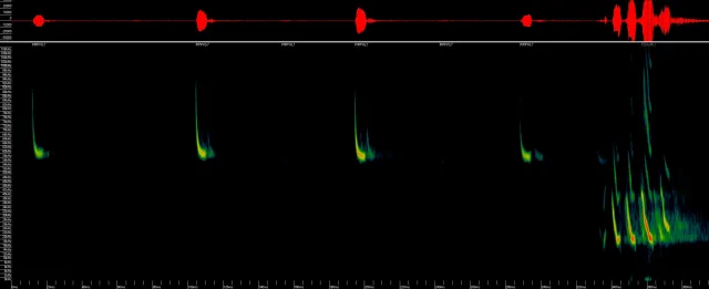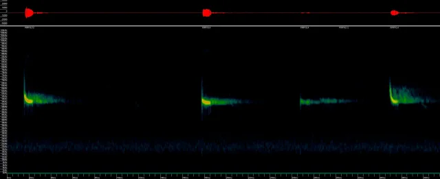 Et eksempelopptak som viser fire ekkolokaliseringsrop fra dvergflaggermus, hvor y-aksen viser frekvensene ropet utgis på (kHz), mens x-aksen henspeiler tiden (i millisekunder). I det gitte eksempelet er det flere essensielle komponenter som kan analyseres: ropene varierer noe i form, hvor første og siste starter på en høyere frekvens (omtrent 61–67 kHz) enn de to i mellom (omtrent 56 kHz). Første og siste har også sterkest desibel ved en noe høyere desibel (56 kHz) enn de to i mellom (54 kHz). Ropene varer i omtrent 8 ms og er etterfulgt av pauser av varierende lengde (omtrent 70 til 150 ms).