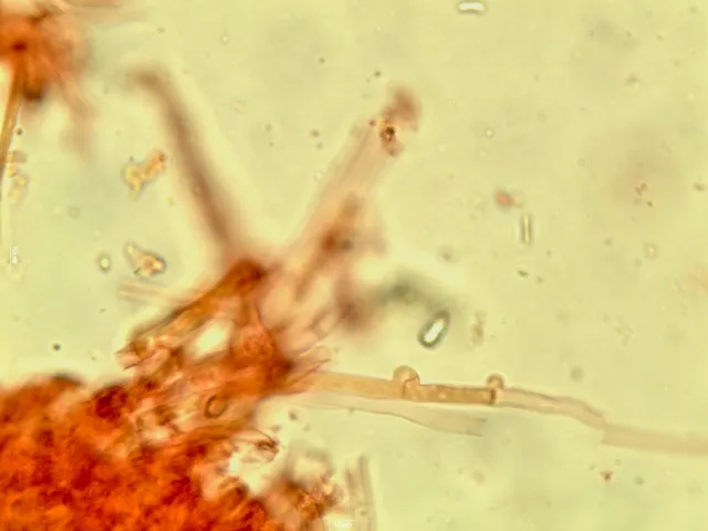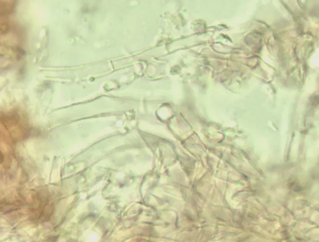 Reaksjon med melzers. Dextrinoid reaksjon på hyfer hos dynekjuke Perenniporia subacida.