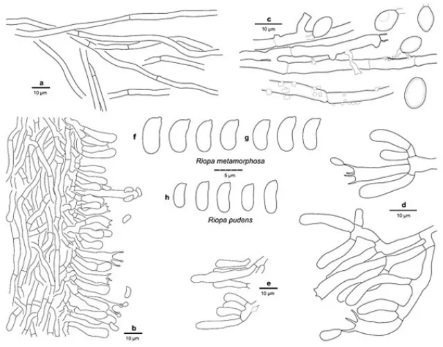 Eksempel på mikroskopkarakterer til lundkjuke Riopa metamorphosa: a) hyfer uten bøyler b) porelaget med de fertile basidiene c) hyfer med sterile sporer (chlamydosporer), d) basidier som produserer sporer, e) cystidier: sterile organer, fgh) sporer.