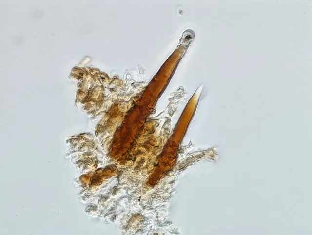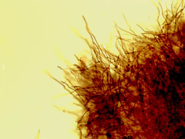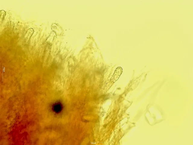 Cystider dekket med krystaller. Her hos sjokoladekjuke Steccherinum collabens.