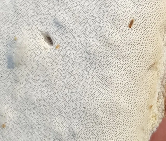 Rutetømmerkjuke Antrodia xantha er sitronfarget som ung og blir blekere med alderen.