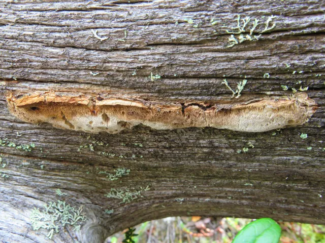 Resupinat ospehvitkjuke Antrodia pulvinascens.