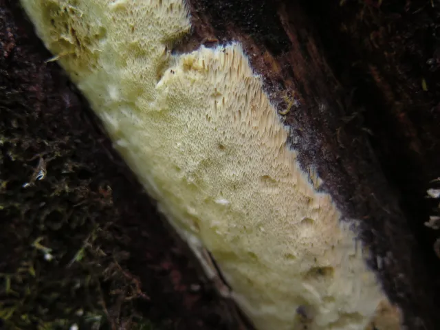 Krympekjuke Ceriporiopsis guidella er en blass gulfarget og stor resupinat kjuke med et oljete utseende som fersk. Her er den funnet ved Dølelva i Namsos i 2022.