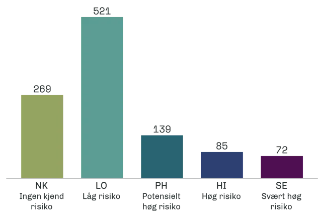 So mange som 157 av dei vurderte dørstokkartane er vurderte til risikokategoriane høg risiko og svært høg risiko, og er dermed det vi kallar høgrisikoartar.