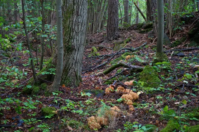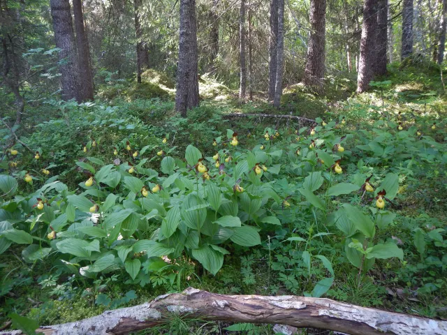 Kalklågurtskog med bartredominans er vurdert til sårbar VU. Den vurderte typen er høyproduktiv og forekommer som små arealer, ofte i lavereliggende og bygdenære områder. Bildet viser kalkgranskog med marisko fra Finnsåsmarka i Trøndelag.