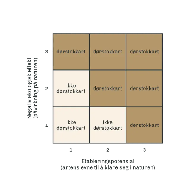 Mørke ruter viser hvilke kombinasjoner av etableringspotensial og økologisk effekt som gjør at arten regnes som dørstokkart for Norge. Skårer arten 3 på en av aksene eller 2 på begge, risikovurderes arten som en dørstokkart. For øvrige kombinasjoner regnes ikke arten for å være en dørstokkart og den faller utenfor avgrensningen for risikovurdering.