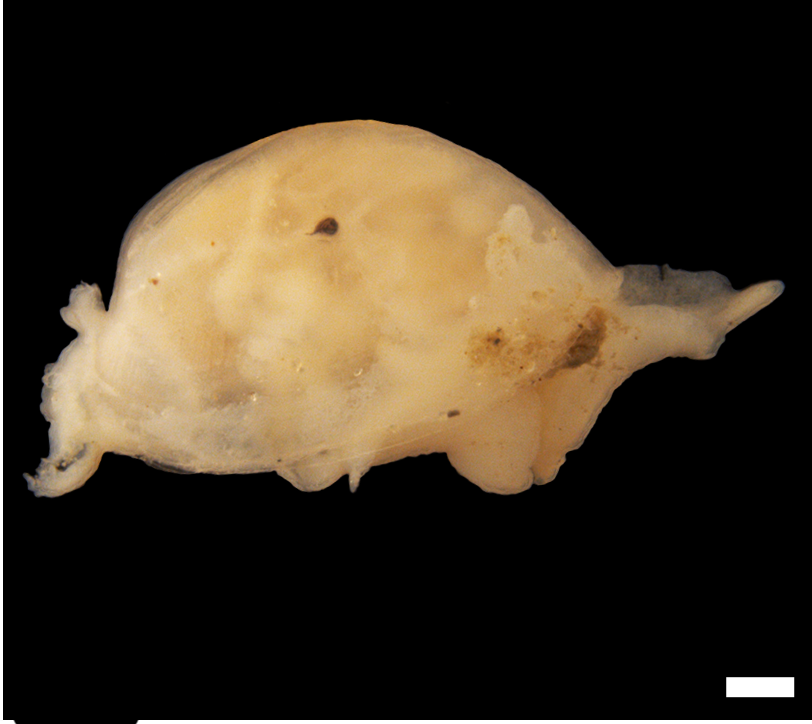 Kroppen er hvit, og hodeskjoldet smalner mot baksiden og mangler en midtlinje. Vevet som dekker skallet (mantelen) er tynt. Mantelen har en forlengelse under sneglen (pallial flik). som er tydelig adskilt fra foten. Denne arten har store synlige øyne.