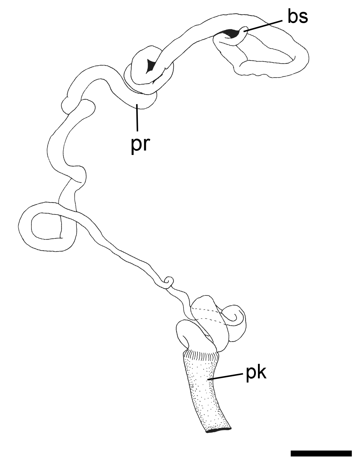 Det hannlige reproduksjonssystemet, målestokk = 250 μm. Forkortelser: pk: peniskammer, pr: prostata, bs: blindsekk.