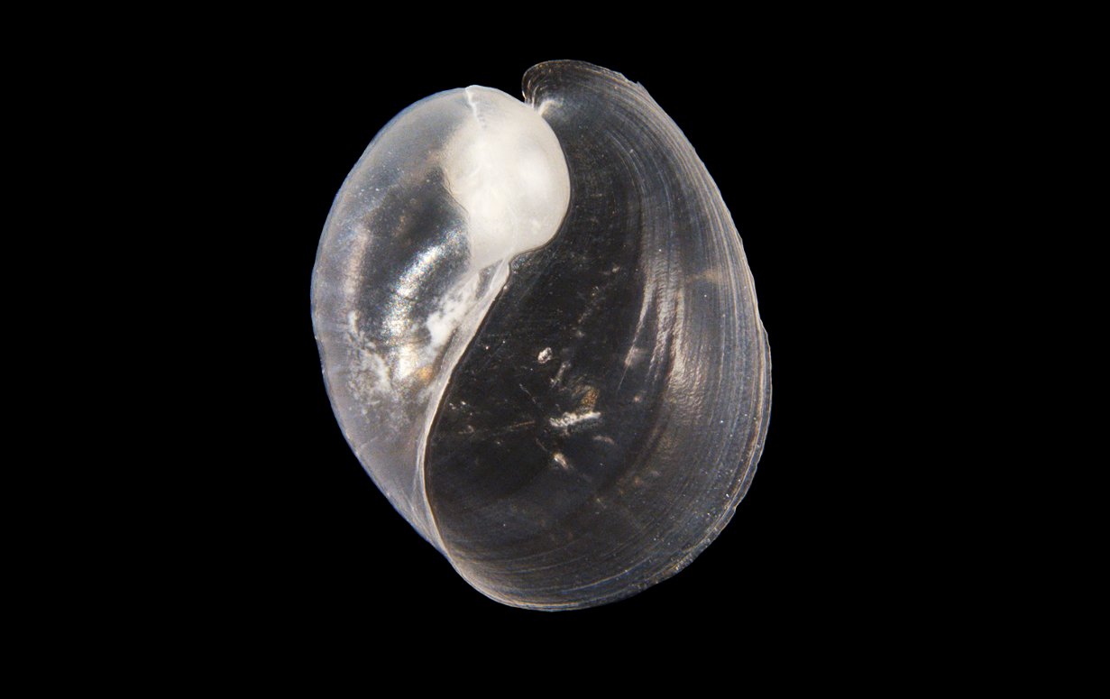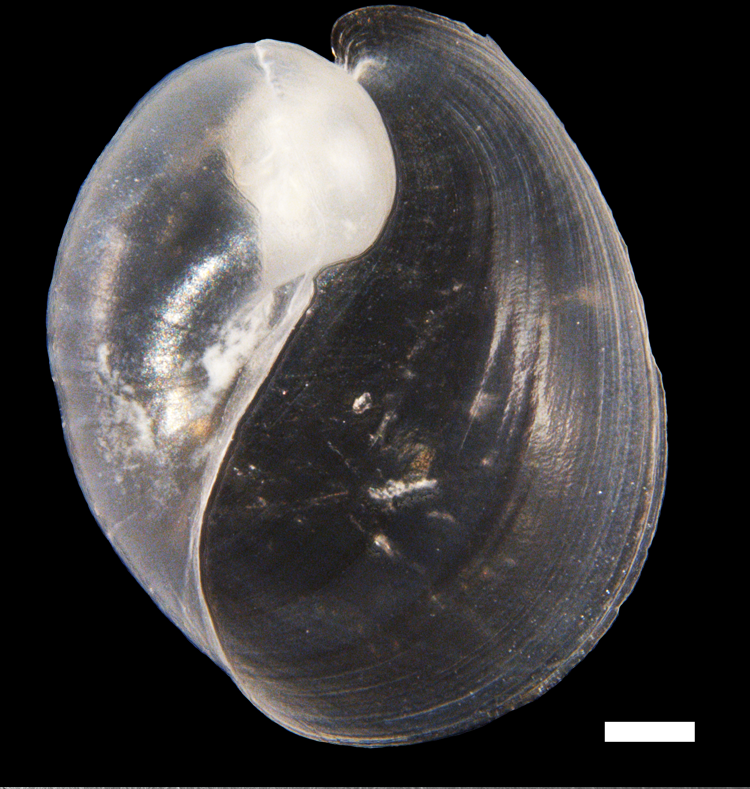 Det tynne skallet er innvendig og gjennomsiktig. Omrisset av skallet er avrundet avlangt sett ovenifra. Åpningen er stor, kanten er glatt og strekker seg hele lengden av skallet. Toppen av skallet (apeks) er nedsunket. Skallet har en umbilikalkanal (umbilicus). Skallets overflate er glatt. Størrelsen på skallet varierer mellom 1,3–3,2 mm.