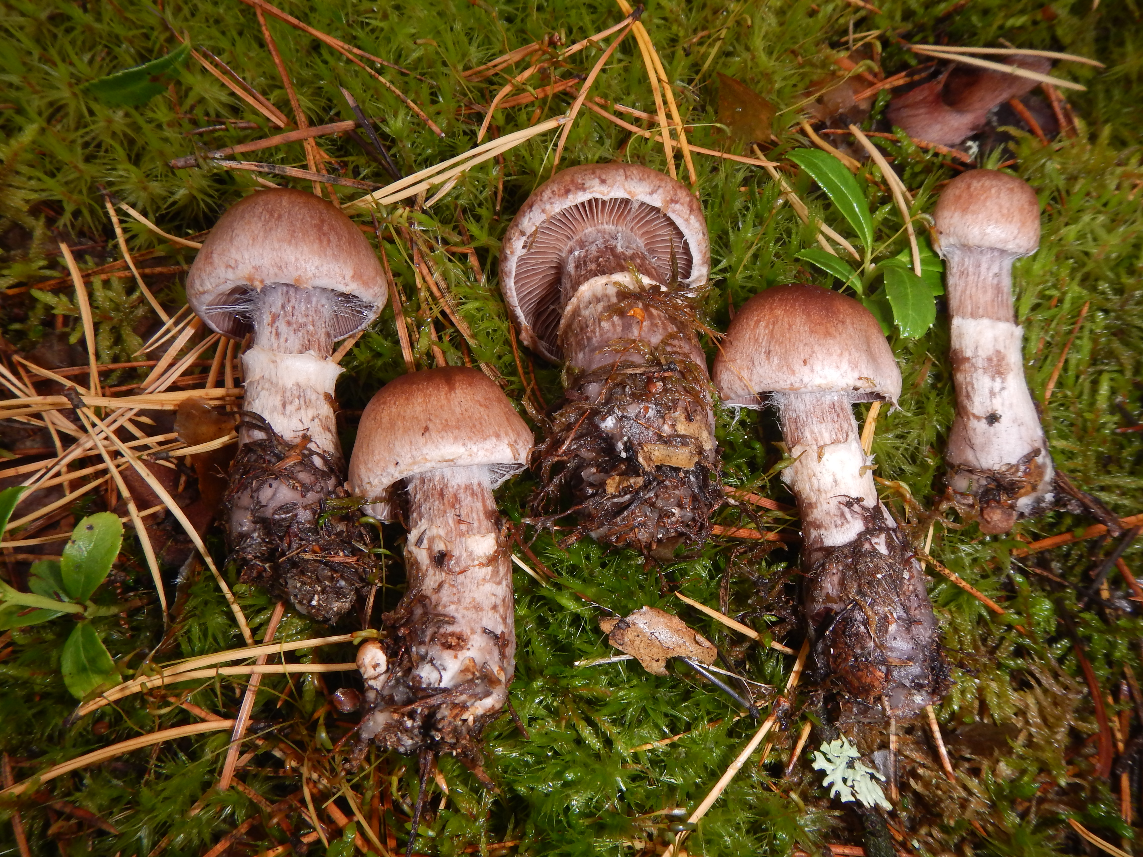 Skivene er middels tette, som unge lyst gråbrune, noen ganger med fiolett skjær, snart mørkebrune. Stilken er 6–10 cm lang og 0,8–1,3 cm bred, oppsvulmet mot basis og her opptil 2,5 cm bred. Den er langsfibret og først grålig blek, siden brun, med et velutviklet velumdekke som danner en sokk og sprekker opp i belter oppover stilken og ender i en ringsone. Kjøttet er mørkebrunt, marmorert, hygrofant, med fiolettskjær, sterkest i stilktoppen. Lukten er ubetydelig eller svakt reddikaktig.