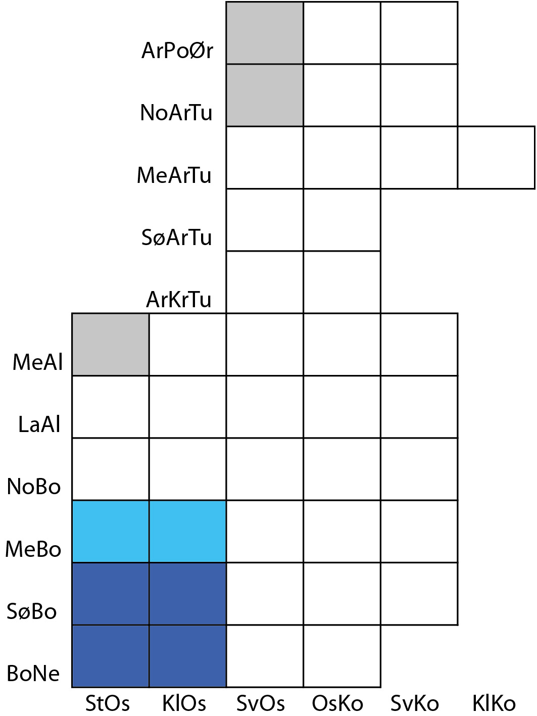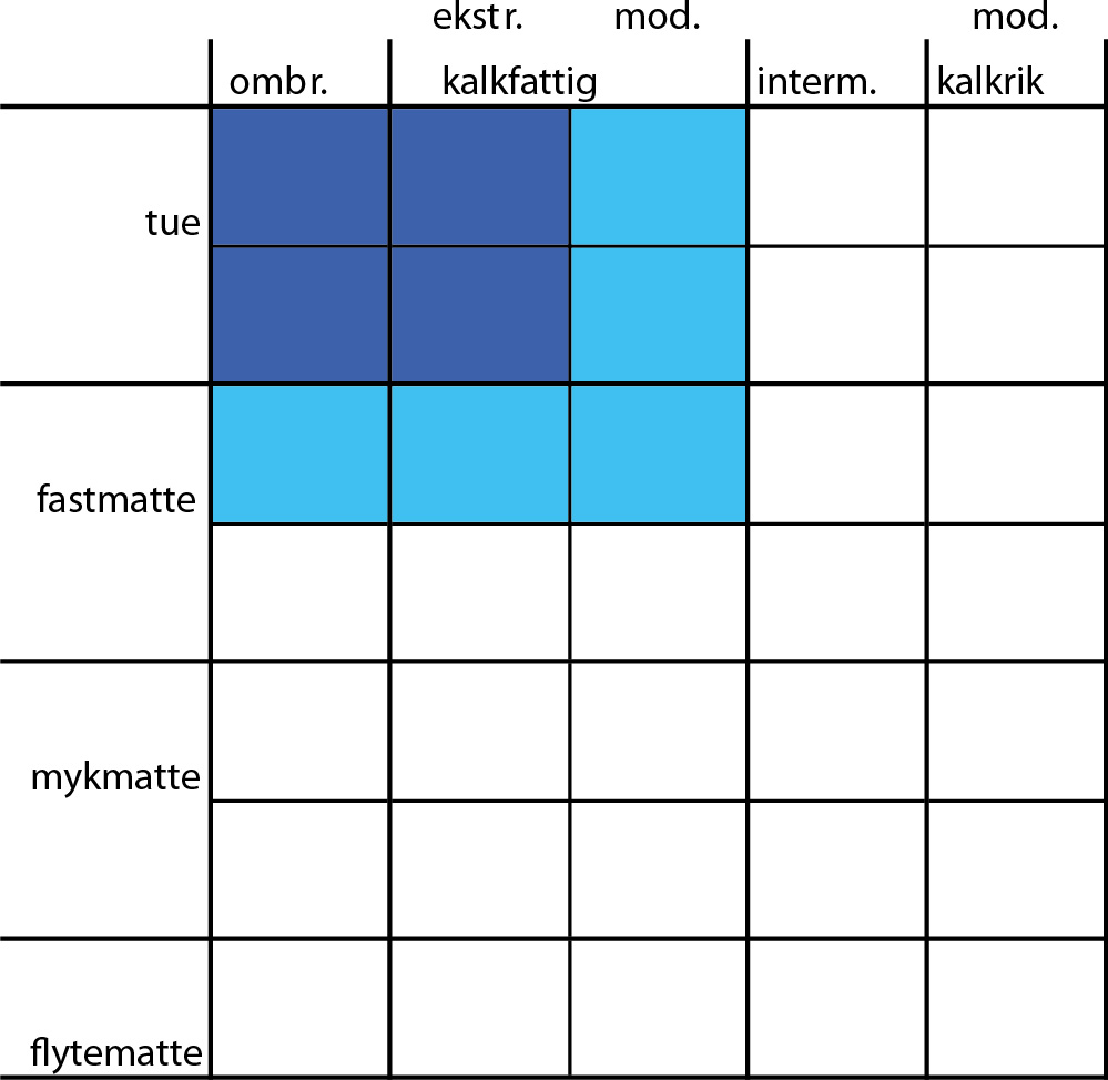 Gruppe: Sterkt til moderat vestlig. Fastlandet: BoNe, SøBo→(MeBo); StOs→KlOs. Spredd i kyststrøkene fra VA: Flekkefjord, BoNe/StOs til Tr: Torsken, MeBo/KlOs.