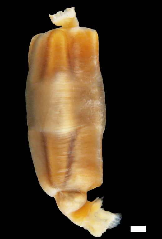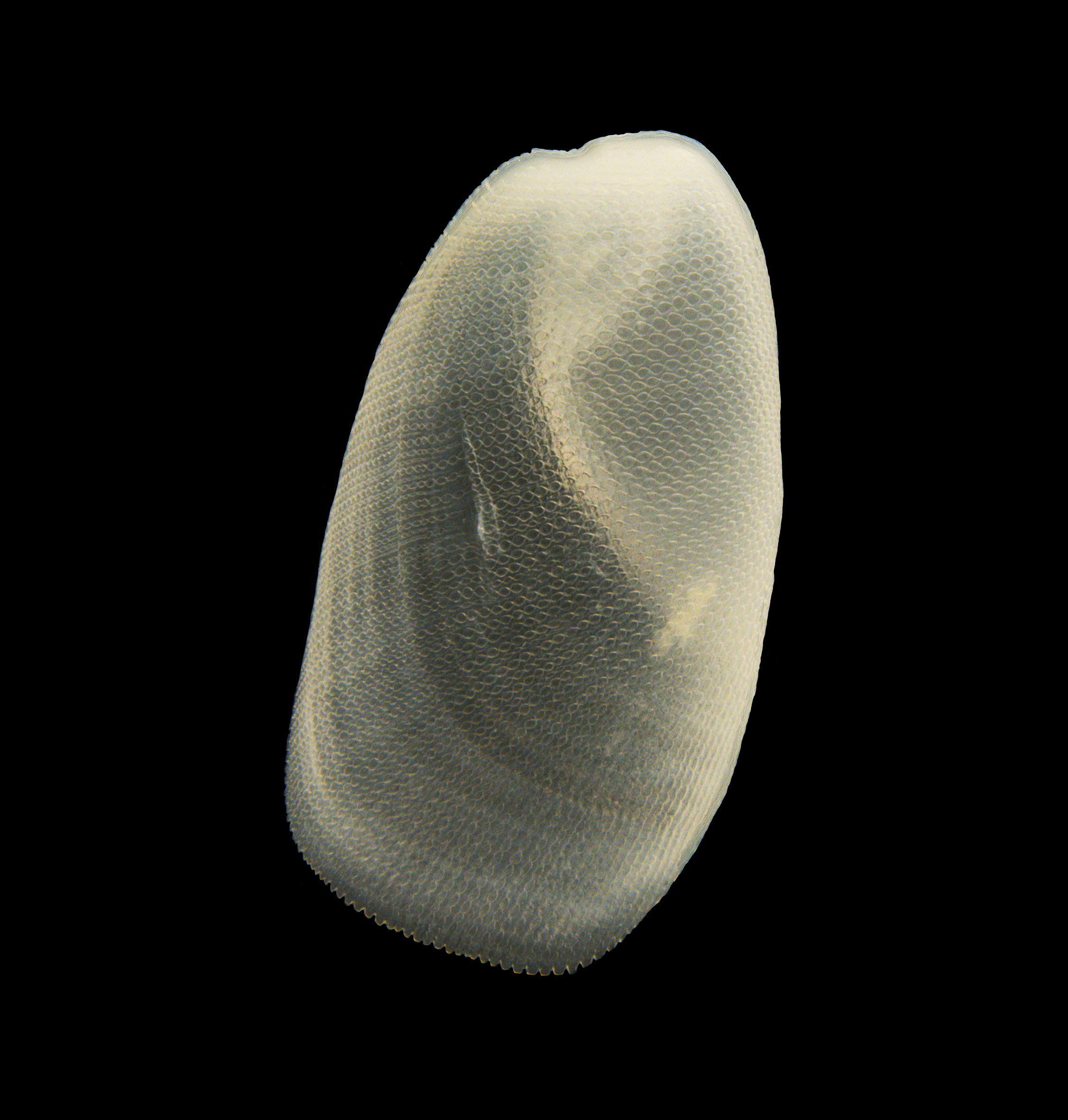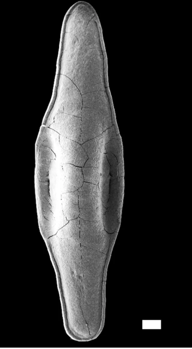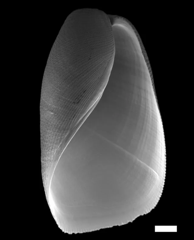 Skallets ventralside (SEM), målestokk = 0,5 mm.