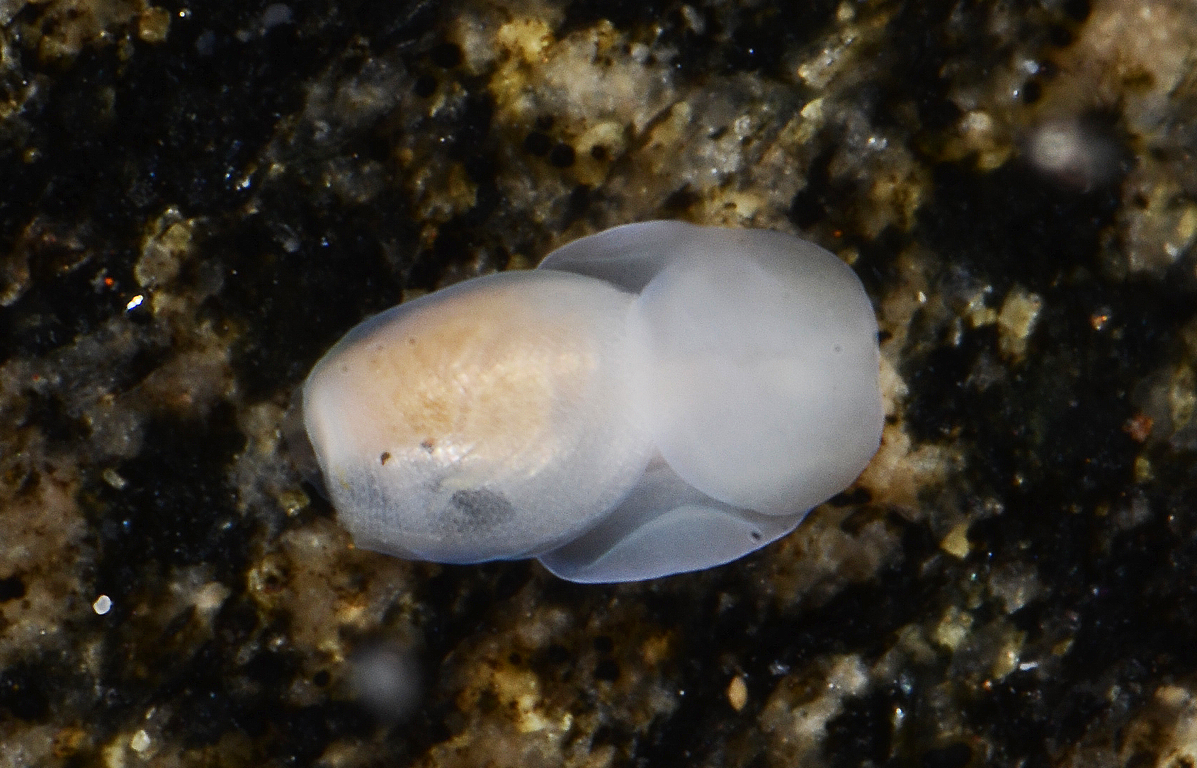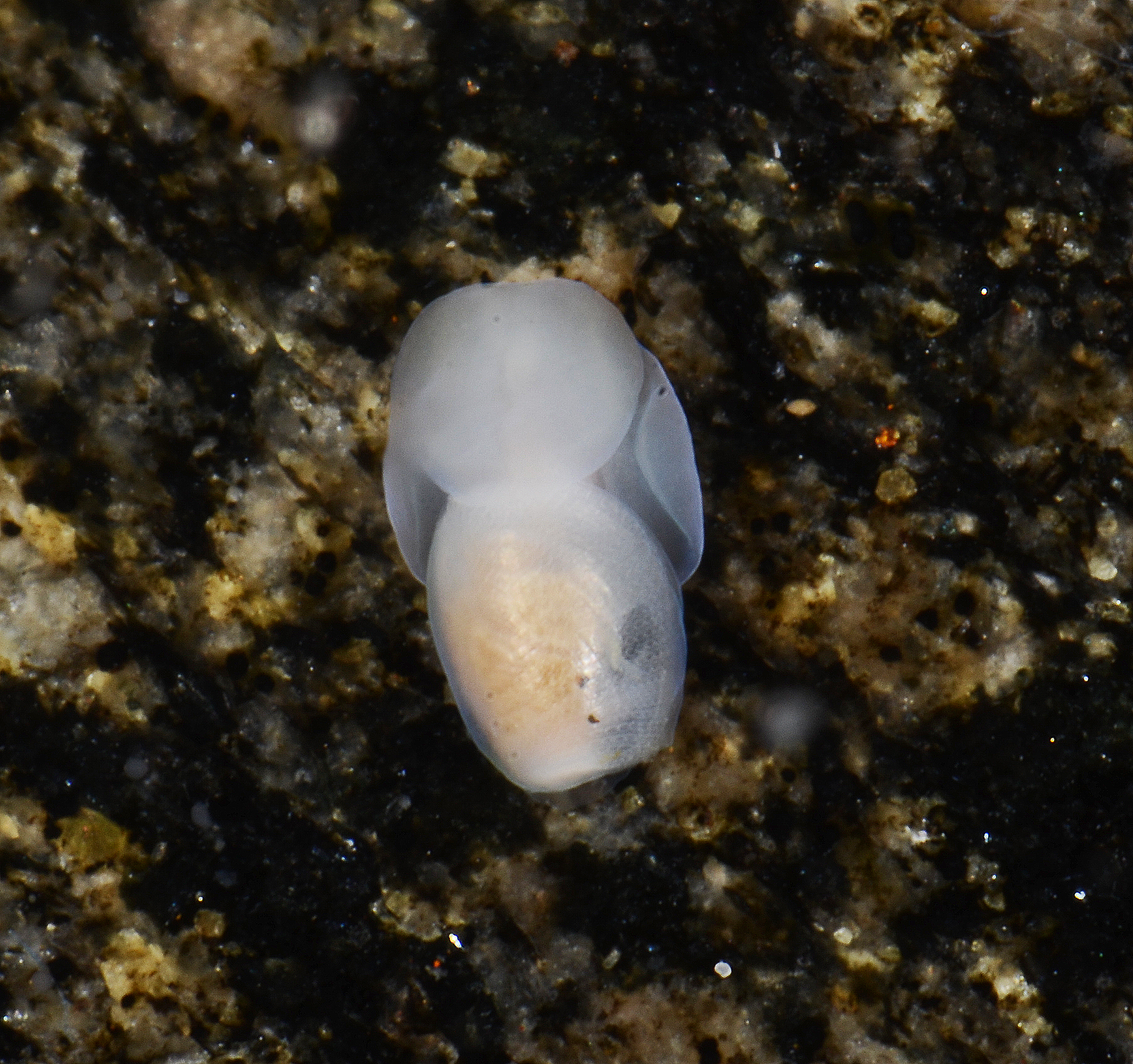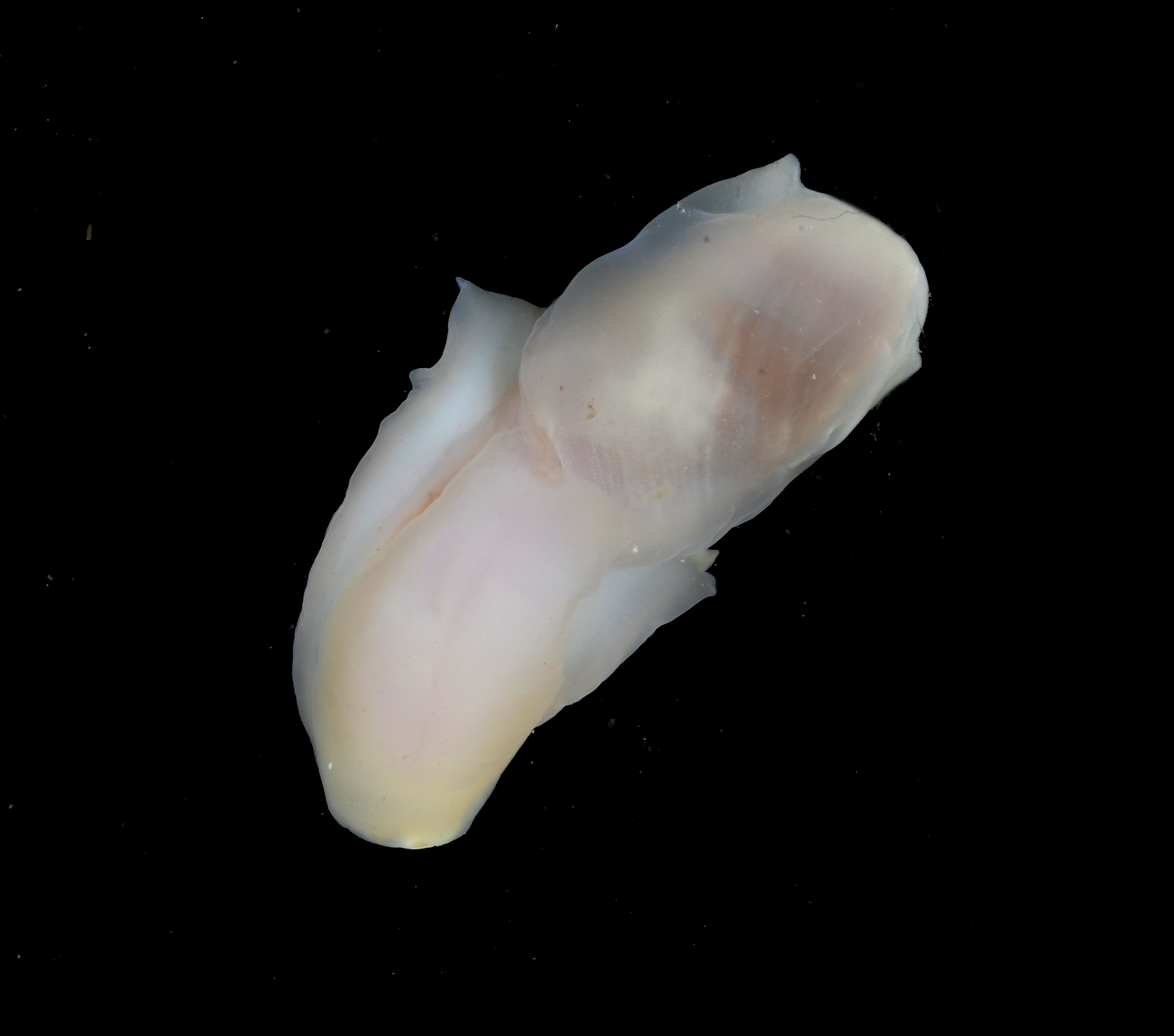 Raspetungen (radula) består av 17–22 tannrekker med en ytre sidetann og en indre sidetann på hver side. Midttannen (rachidie) mangler. De ytre sidetennene er rett til kurvet med en bred base og runde tupper. De indre sidetennene er kurvet med en bred base og flate tupper. Spyttkjertlene er litt lenger enn den delen av det fremre fordøyelsessystemet som inneholder raspetungen (bukkalmassen). Kråsen (tyggemagen) er avlang, sylindrisk og dekket av muskelfibere, disse er tykkest på midten av kråsen. Kråsen inneholder kråsplater som er avlange og identiske i form, overflaten av disse platene er gul-oransje. Undersiden av platene er hvitaktige, med to fordypninger på hver side på midten og er omkranset av en gjennomsiktig kant. Det hannlige reproduksjonssystemet består av en lang tynn prostata som er koblet til et sekkeformet peniskammer, dette blir smalere mot kjønnsåpningen.