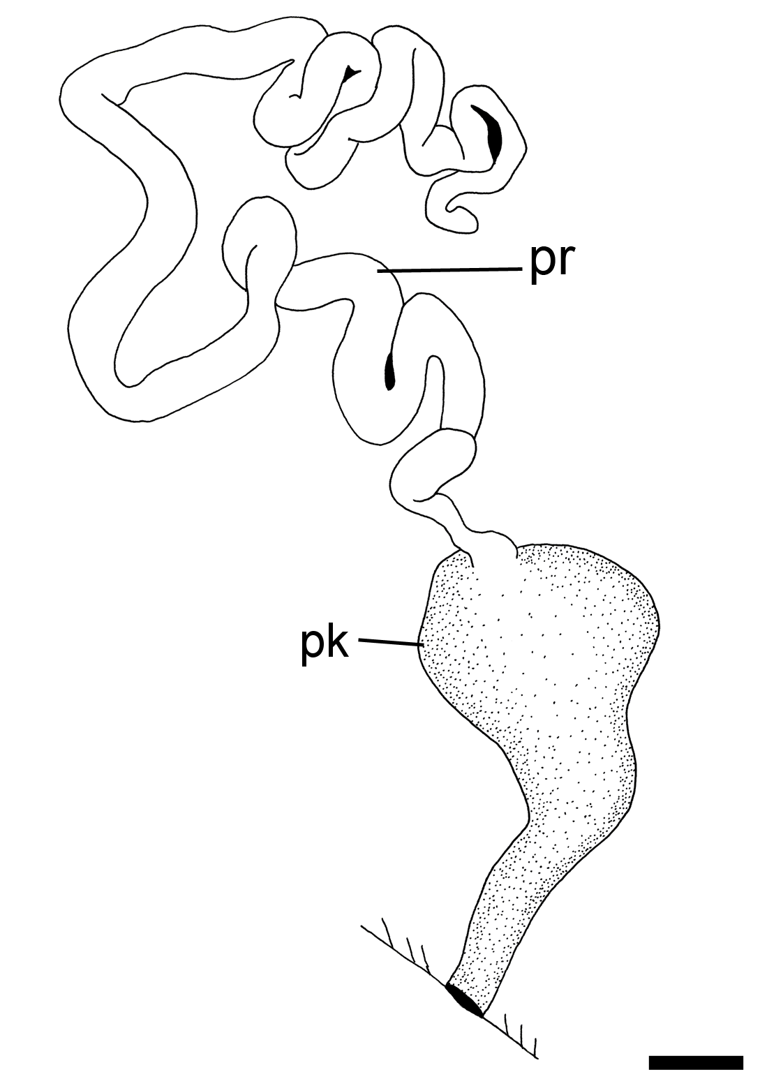 Det hannlige reproduksjonssystemet, målestokk = 0,5 mm. Forkortelser: pk: peniskammer, pr: prostata.