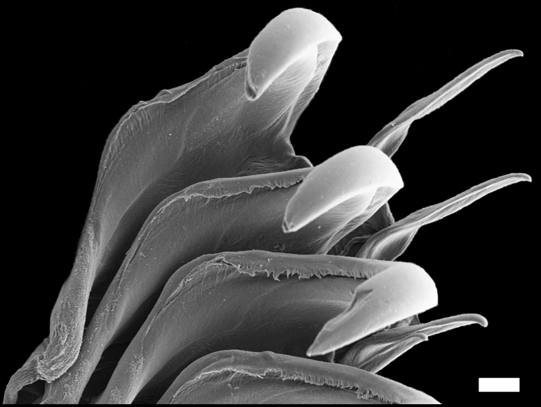 Detalj av radula (SEM), målestokk = 20 µm.