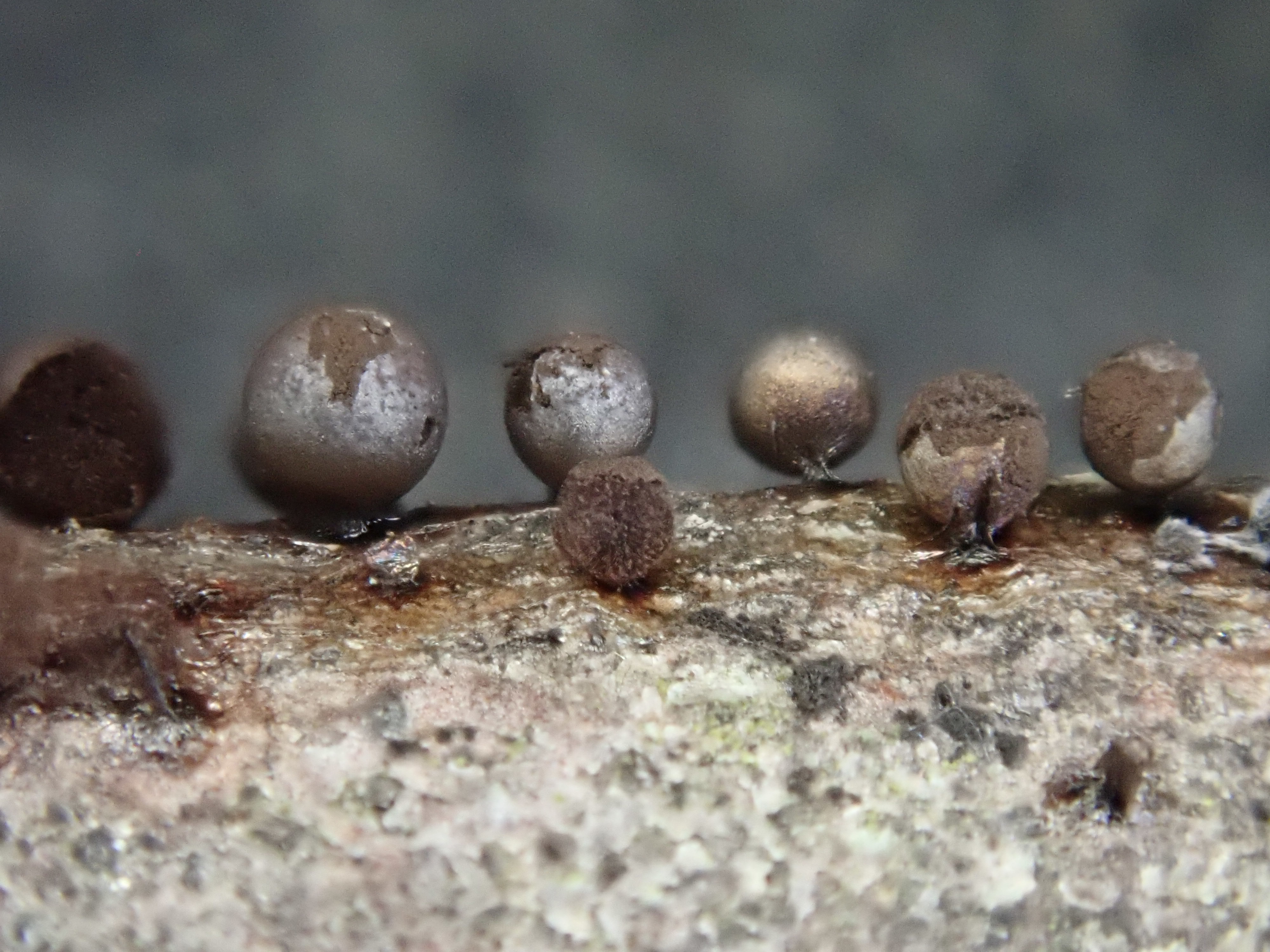 Lamproderma argenteobrunneum er en tilsynelatende sjelden, men litt vanskelig slimsopp å bestemme. Den er kulerund, oftest uskaftet og ganske anonym grålig med små, fargeløse flekker. Dette er en art som forekommer på kvister, lyng, visne urter og lignende om våren, i tiden rundt snøsmeltingen.