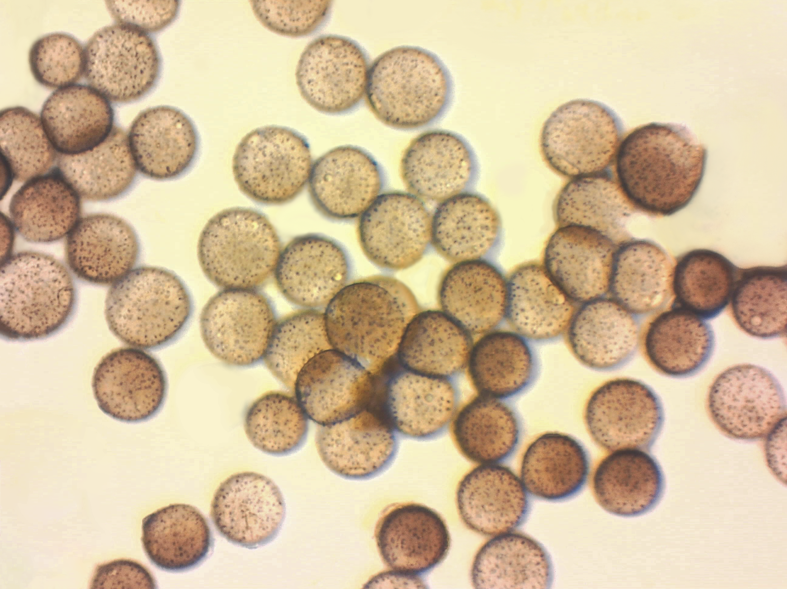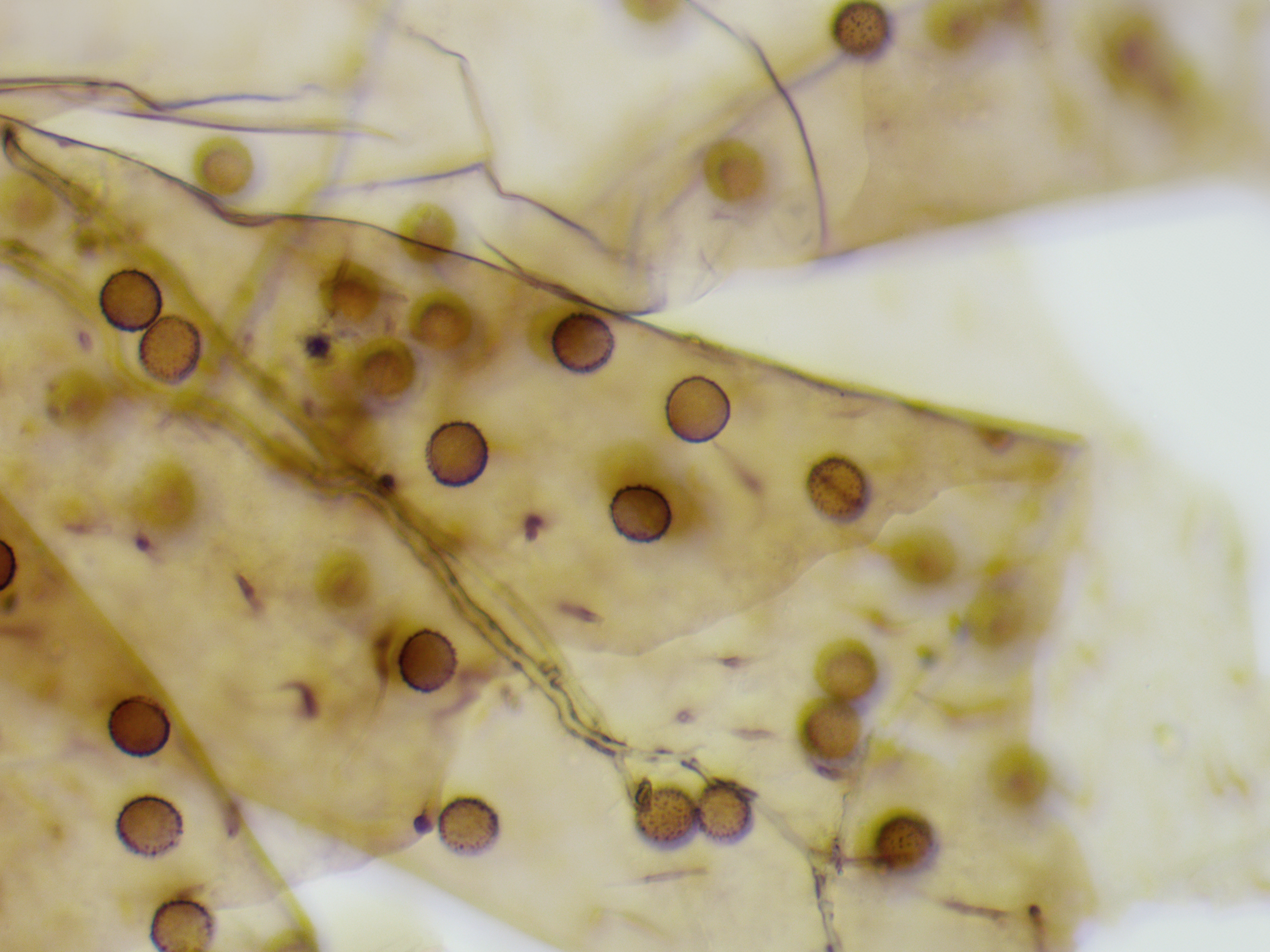 Arten har uskaftede eller svært kortskaftede, grålig-sølvglinsende (men gjerne noe gyllen i nedre del), kuleformede sporokarper. Peridiet er lyst brunt med små, fargeløse flekker og av og til med små kapillitierester. Sporene er relativt små (<11 µm) med spredte pigger som delvis flyter sammen og danner små åser.