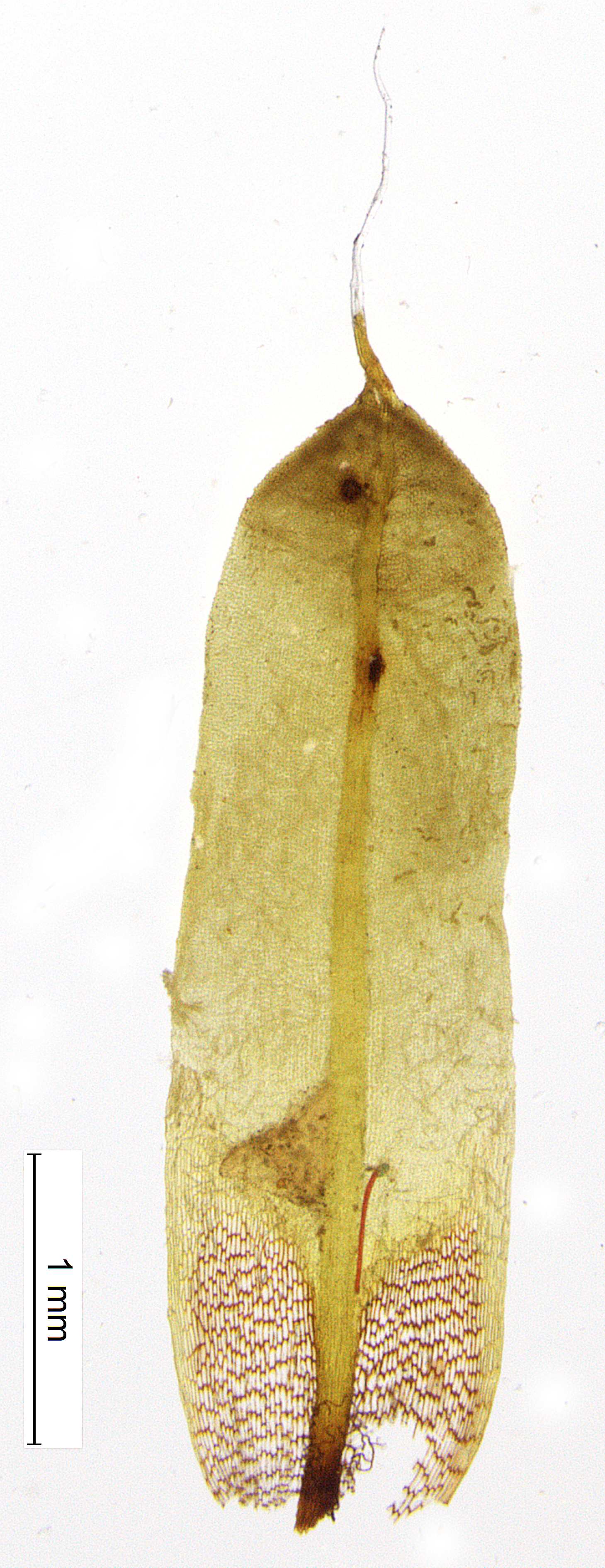 Tungeformet blad med hårspiss (t.v.), bladspiss med nerve går ut i en fargeløs hårspiss (t.h.).