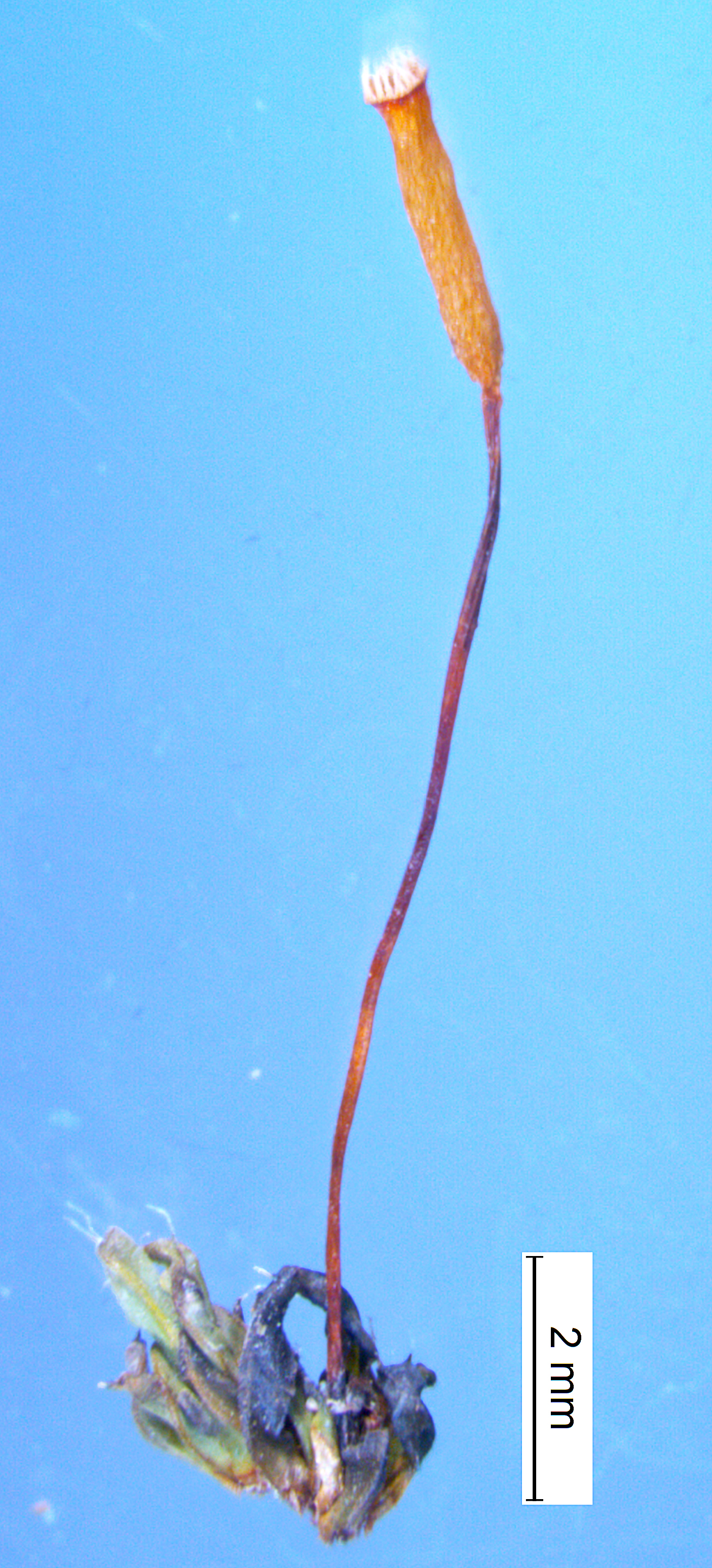 Sporehuset er glatt og med lyse peristomtenner (t.v). Skudd med sporofytt (t.h).